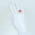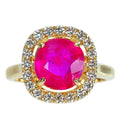 モザンビーク産2.60ctのルビーは、ややピンクがかったレッドカラーで、よく見ると肉眼でもインクルージョンが確認できますが、テリのある石です。メレダイヤモンドと、ペアーシェイプダイヤモンドで2重に取り巻いたデザインも個性的かつゴージャスです。