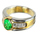 0.98ctオーバルミックスカットのエメラルドは、肉眼でもインクルージョンが確認できるものの、明るめのグリーンカラーで、テリのある石です。アーム部にセットされたバゲットカットダイヤモンドは色合い、透明度、テリとも申し分のない上質品です。