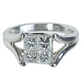 4ピース計1.00ctのプリセンスカットダイヤモンドを「田」型に、セミインヴィジブルセッティングしたプラチナベースのリングです。バネ特性のないプラチナで四隅以外「爪」を使わずにダイヤモンドをセットするには、精度の高いつくりが必要です。