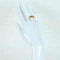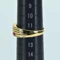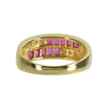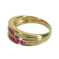 バゲットカットのルビーを2列、段違いになるようレール留めした、シャープな印象のゴールドリングです。