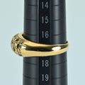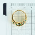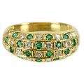 甲丸状のゴールドリングに、エメラルドとダイヤモンドをそれぞれ18ピースずつセットされています。石留めは職人の手によるもの。