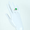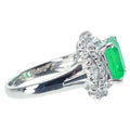 2.10ctのエメラルドは、やや淡めのグリーンカラーで、それほど透明感が高いわけではありませんが、テリのある石です。リング本体は、エメラルドの周りをダイヤモンドで2重に取り巻いた華やかなデザインに仕上げられています。