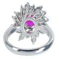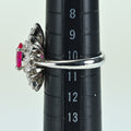 1.31ctのビルマ産ルビーは、ほんのりピンクがかったレッドカラーで、僅かに色抜け部分が見受けられるものの、発色のよいテリのある石です。リング本体は、18ピース計1.463ctの上質マーキスダイヤモンドで取り巻いたゴージャスかつエレガントなデザインに仕上げられています。