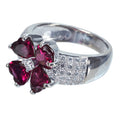 4ピース計3.12ctセットされたハートシェイプカットのガーネットは、レッドとパープルの間の色合いで、内包物が気にならないテリのある石です。リング本体は、ガーネットを四葉のクローバーのように配し、センターの花弁に当たる部分とアーム部にダイヤモンドを配した、華やかなデザインに仕上げられています。