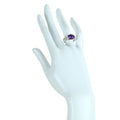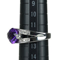 "12.0mm×9.0mmサイズのアメジス トを横向きにセットしたタサキのリングです。アメジストは色合い、透明度、テリとも申し分のない上質品。しっかりしたつくりもアピールポイントです。"