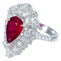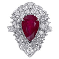 2.53ctのビルマ産ルビーは、あまり透明度は高くありませんが、すばらしいレッドカラーでテリのある石です。リング本体は、ルビーの周りをトータル1.73ctのダイヤモンドで取り巻いたゴージャスなデザインに仕上げられています。圧倒的な存在感をお楽しみください。