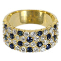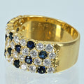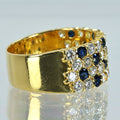 8.9mm幅の平打ちリングに、サファイアとダイヤモンドを敷き詰めるようにセットしたゴージャスなゴールドリングです。中指用としてもおススメです。