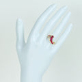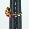 指を美しく見せるVラインを基調としたゴールドリング。ルビーとダイヤモンドを巧みに対比させるデザインセンスがアピールポイントです。