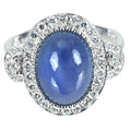 8.26ctのスターサファイアは、ほんのりグレーがかったブルーカラーで、センターから少しズレた位置にではあるものの、ハロゲンなどの強い光の下では6条のアステリズムを浮かび上がらせます。エレガントで華やかなデザインもアピールポイントです。
