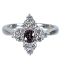 0.42ctのアレキサンドライトは、それほど大粒ではありませんが、通常光下ではBluish Green、,ハロゲン光などの下ではPupleにがらりと色を変える上質品。透明感、テリのある石です。ダイヤモンドも申しぶんのない品質のものがセレクトされています。使用感のない美品です。