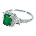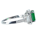 The 1.40 ct emerald has inclusions that can be seen with the naked eye upon close inspection, but its deep green color is what makes it so appealing. The ring itself has a delicate and elegant design, with tiny diamonds neatly set around the emerald and down the arms.