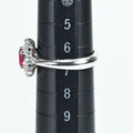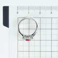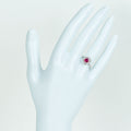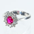 0.38ctのルビーはわずかにピンクがかった色合いで、よく見ると内部にインクルージョンが確認できますが、テリのある石です。ルビーを取り巻いたダイヤモンドはカラーレスでインクルージョンが目立たないものがセレクトされています。